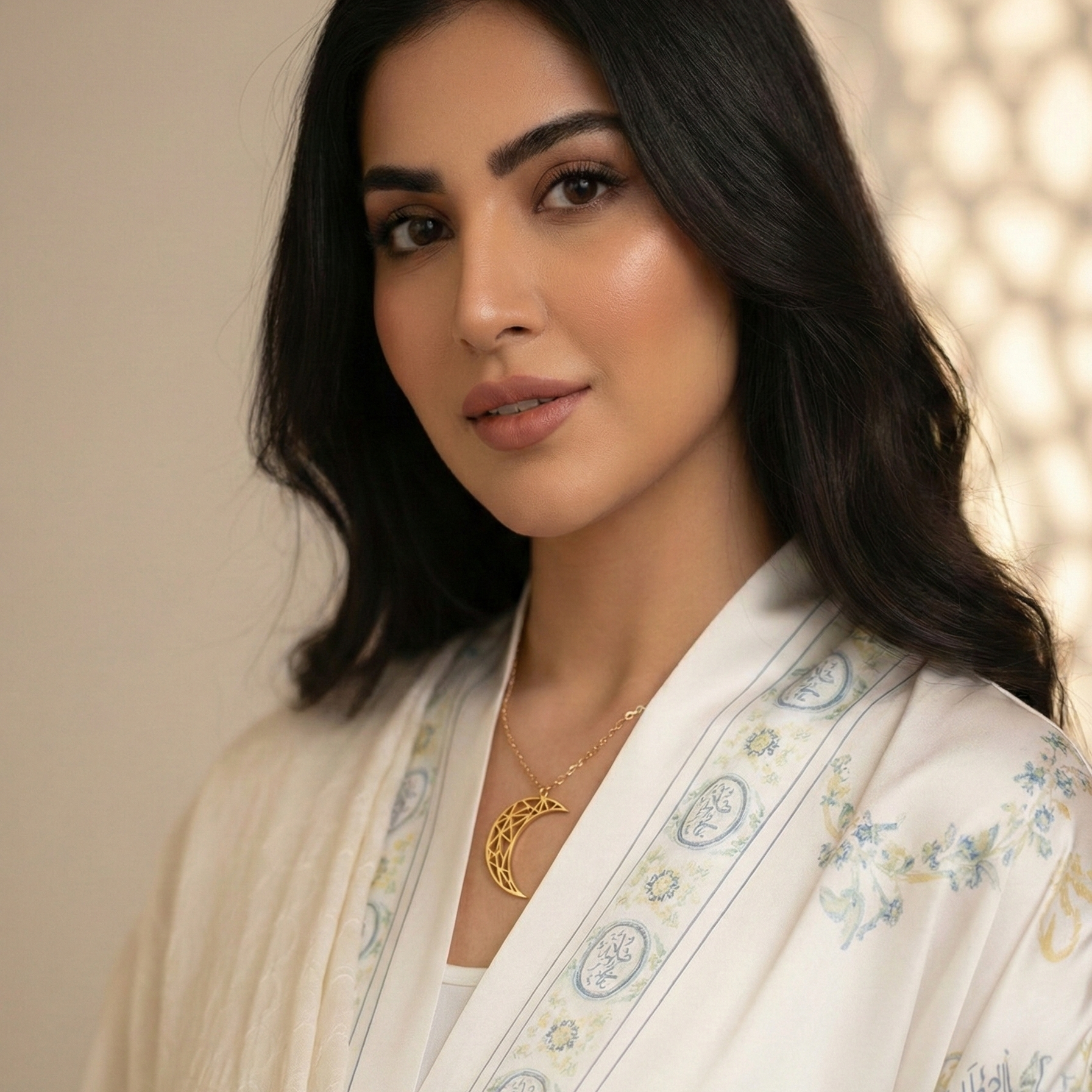 A modern tribute to architectural heritage, this necklace features a stunning crescent moon pendant defined by an intricate, laser-cut geometric lattice. The openwork design creates a captivating play of light and shadow against the skin, reminiscent of traditional mashrabiya patterns. Suspended from a delicate, high-polish gold-plated chain, making it an essential statement for the modern woman.