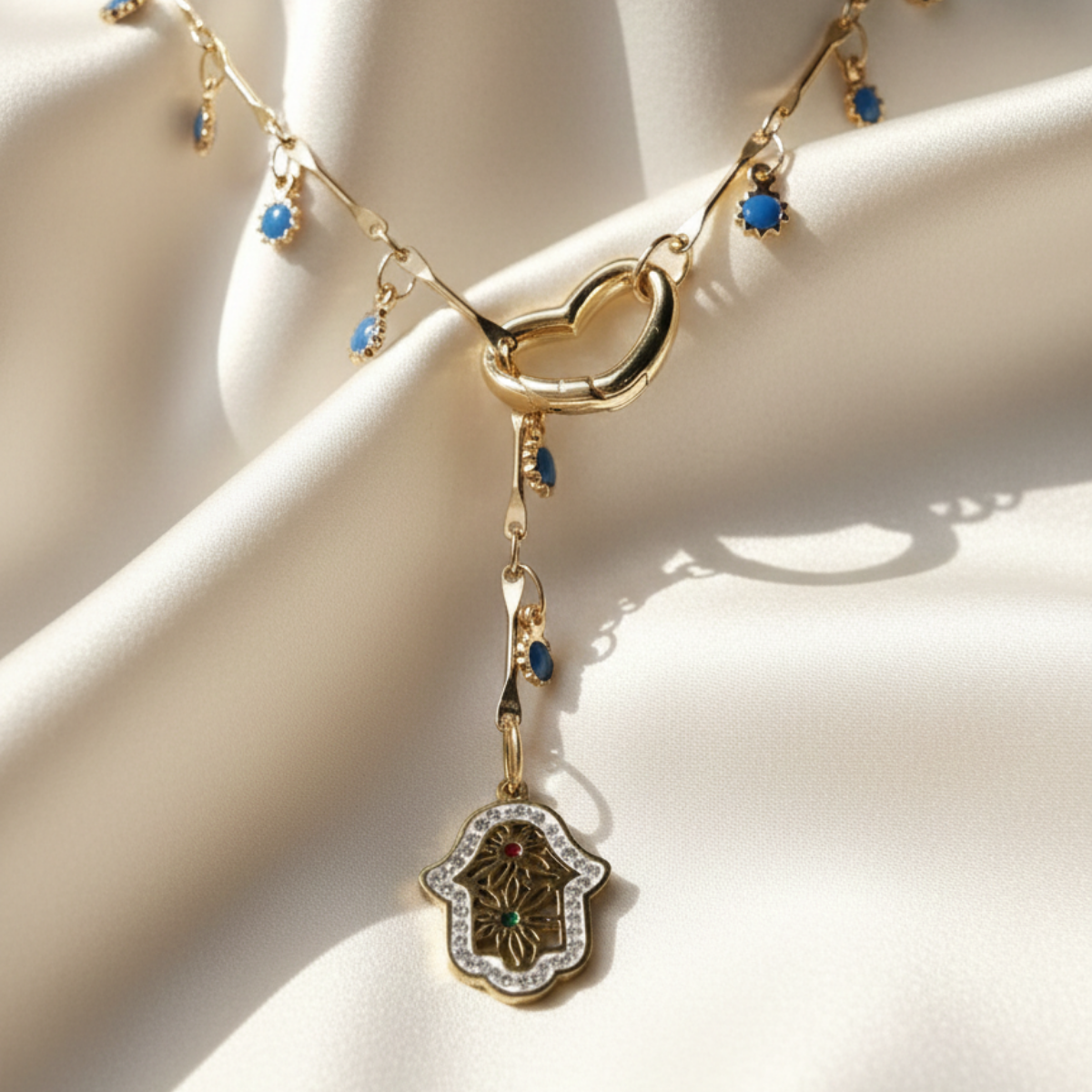 A contemporary reinterpretation of heritage, this handcrafted lariat necklace features a meticulously detailed Hama (Hand of Fatima) pendant, framed with pavé-set crystals and accented with vibrant emerald and ruby-toned centers. The 316L Stainless Steel chain, plated in 18K gold, is rhythmically adorned with celestial blue enamel charms and a central heart-shaped carabiner, blending symbolic protection with a modern touch.