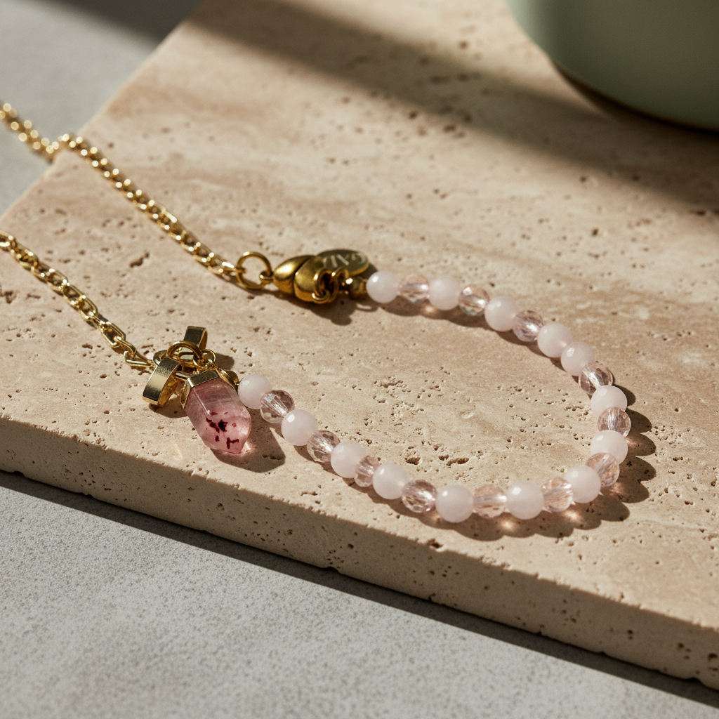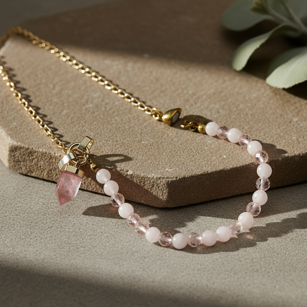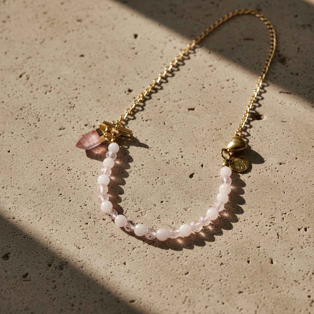 تُوازن هذه القطعة الرائعة بين سلسلة ذهبية رقيقة وخيط من خرز الكوارتز الوردي المصقول وخرز الكريستال المصقول. وتُشكّل نقطة كوارتز وردي مصقولة يدويًا نقطة جذب قوية إلى جانب ميدالية تحمل توقيع حرفي. يجسّد التصميم أناقة هادئة تنتقل بسلاسة من النهار إلى المساء.