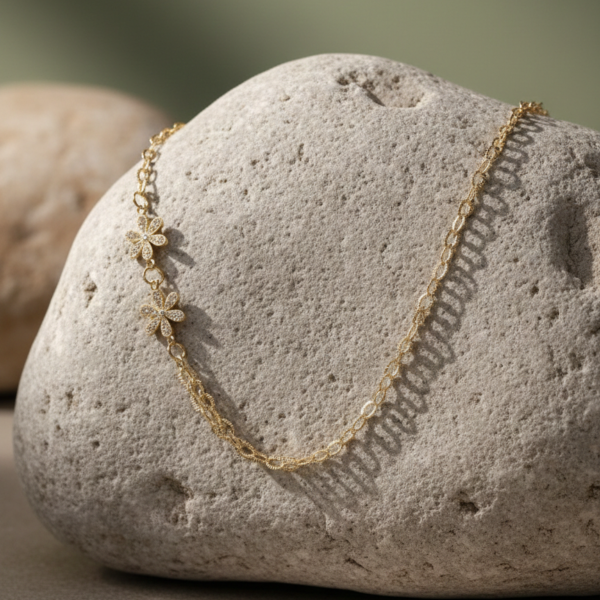 A delicate fusion of organic inspiration and refined craftsmanship unfolds through a classic link chain in 18K gold-plated finish, accented by two asymmetric crystal-encrusted blossoms. The intricate pavé setting captures light with every movement, while an elegant lock ensures secure wear with sophisticated detail.