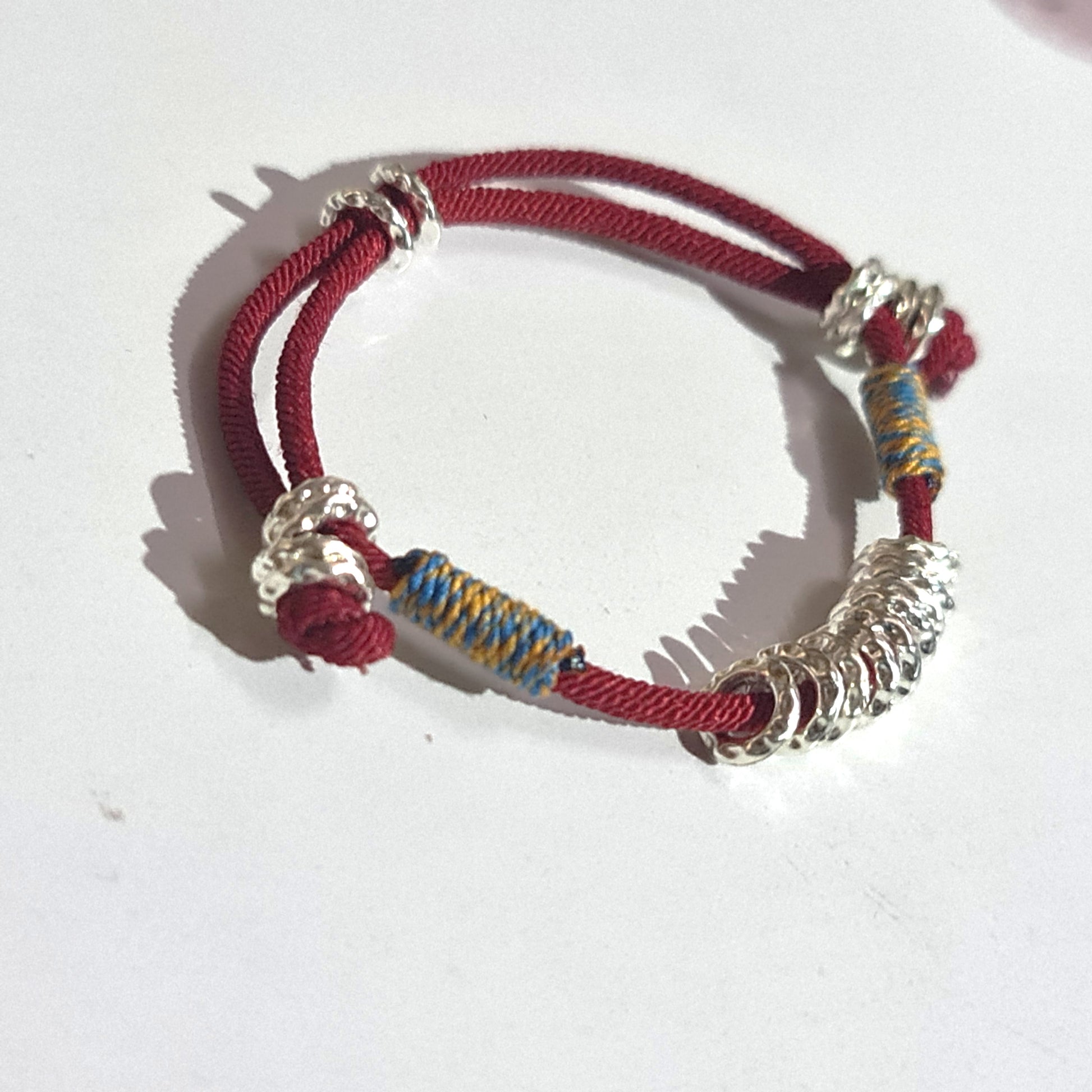 A meticulously hand-woven band of colored thread interlaced with multiple small silver-toned rings. Each ring is threaded through the woven strands, creating a rhythmic pattern of metallic brilliance against soft thread. The adjustable sliding cord allows you to tighten or loosen the fit effortlessly, celebrating infinite bonds and artisan craftsmanship.