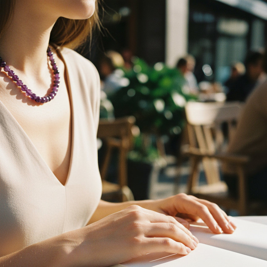 A minimalist strand of hand-selected Amethyst beads, showcasing a spectrum of deep purple tones and natural clarity. This piece is elegantly finished with a gold-plated 316L stainless steel clasp, offering a refined balance of organic texture and polished durability for the modern aesthete.