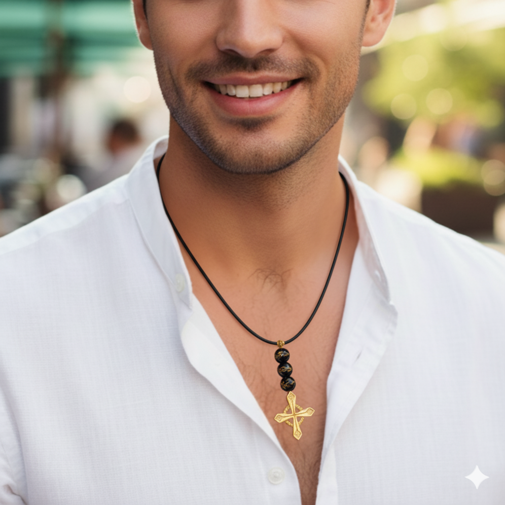 The Filigree Golden Cross Necklace blends sacred symbolism with refined elegance through its gold-plated cross and the deep, polished beauty of onyx detailed with golden patterns. Handcrafted with intention, it carries a sense of protection, strength, and quiet sophistication.