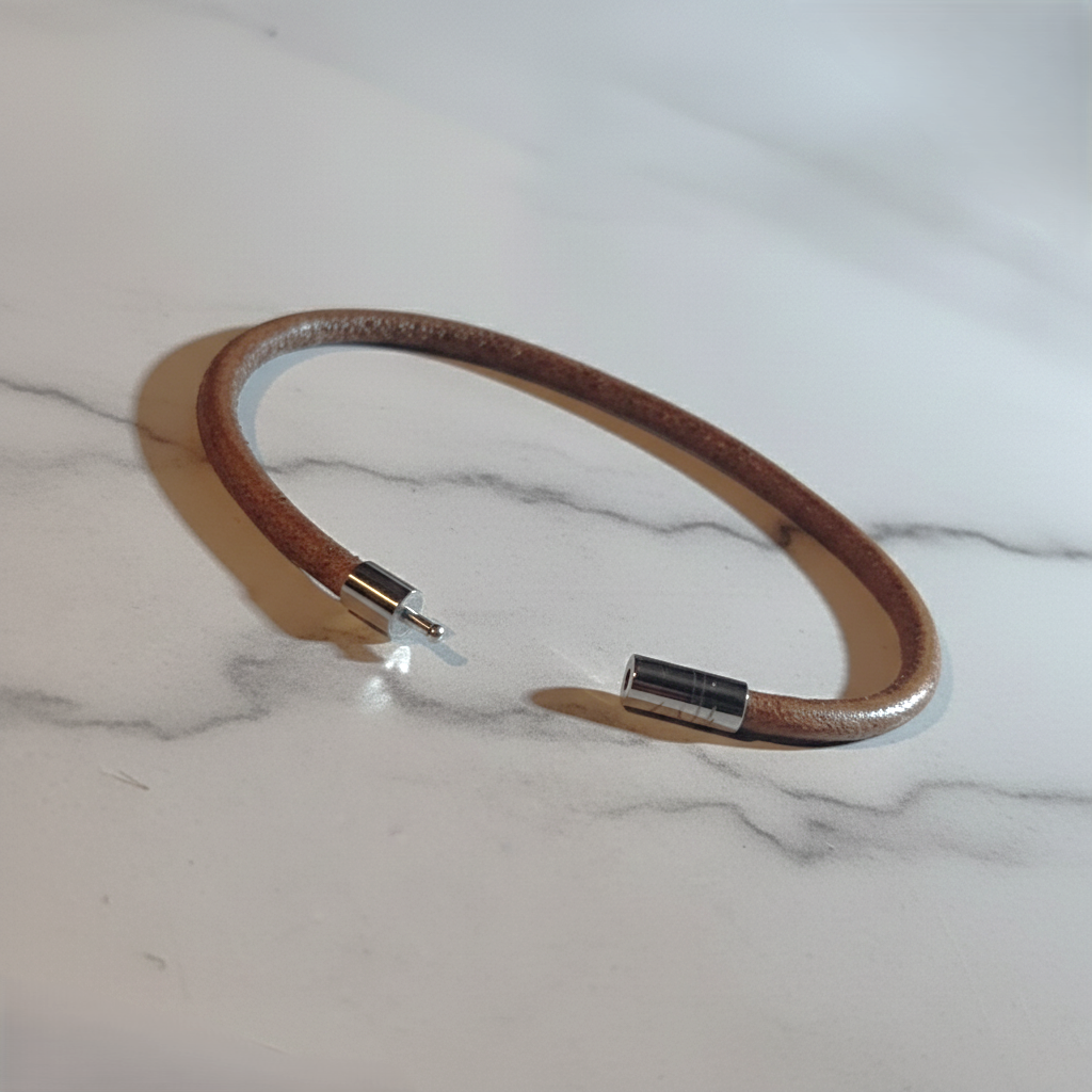 A slender, cylindrical leather cord bracelet available in black and tan variants. The piece is finished with a polished stainless steel clasp for a seamless and modern look.